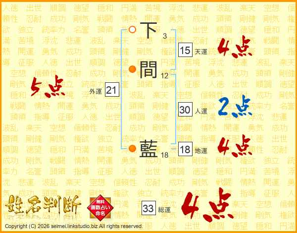 生活面を象徴する運勢です。外部から受ける影響力を表し、結婚運、家庭運や職場、環境への順応性を表します。総運から人運を引いた画数。姓や名が1文字の場合を除く。