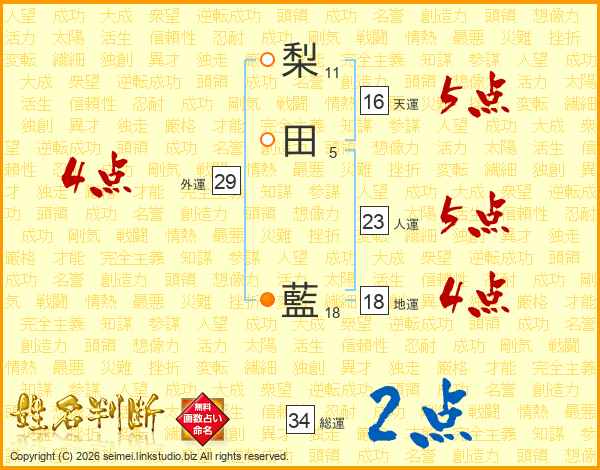 梨田藍さんの天運は16画の5点!