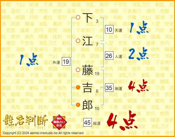 下(3画)江(7画) 藤(19画)吉(6画)郎(10画)