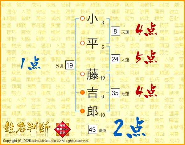 小(3画)平(5画) 藤(19画)吉(6画)郎(10画)