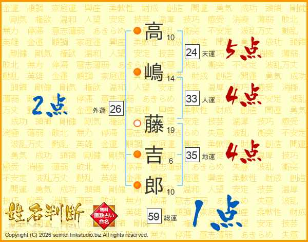 高(10画)嶋(14画) 藤(19画)吉(6画)郎(10画)