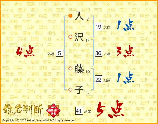 生活面を象徴する運勢です。外部から受ける影響力を表し、結婚運、家庭運や職場、環境への順応性を表します。総運から人運を引いた画数。姓や名が1文字の場合を除く。