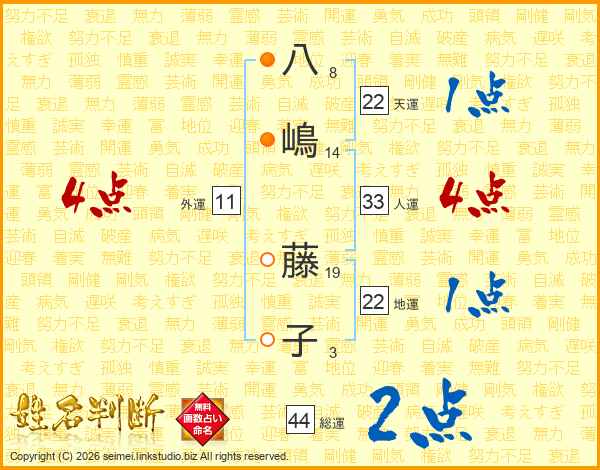 八(8画)嶋(14画) 藤(19画)子(3画)