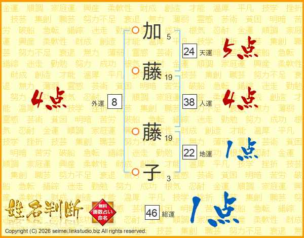 加藤藤子さんの総運は46画の1点!
