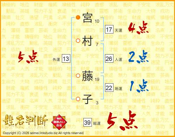 生活面を象徴する運勢です。外部から受ける影響力を表し、結婚運、家庭運や職場、環境への順応性を表します。総運から人運を引いた画数。姓や名が1文字の場合を除く。