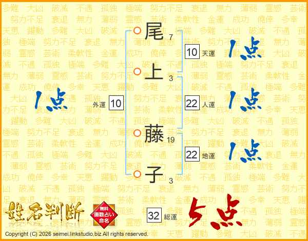 尾(7画)上(3画) 藤(19画)子(3画)