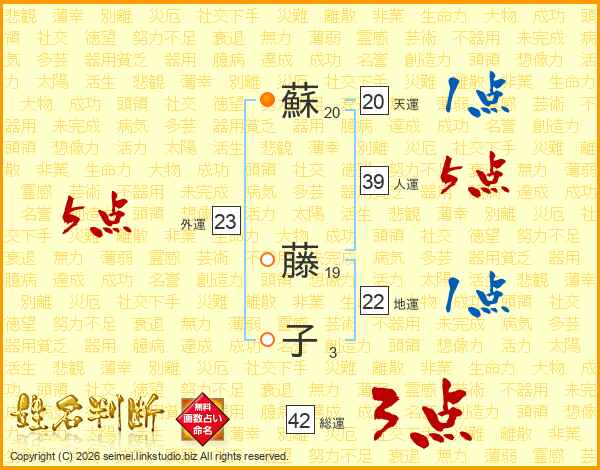 生活面を象徴する運勢です。外部から受ける影響力を表し、結婚運、家庭運や職場、環境への順応性を表します。総運から人運を引いた画数。姓や名が1文字の場合を除く。