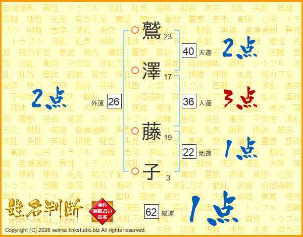 鷲(23画)澤(17画) 藤(19画)子(3画)