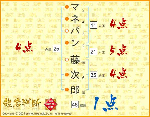マ(2画)ネ(4画)パ(3画)ン(2画) 藤(19画)次(6画)郎(10画)