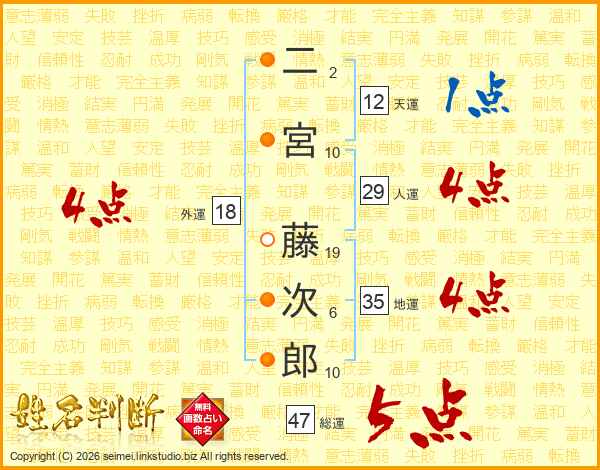 二(2画)宮(10画) 藤(19画)次(6画)郎(10画)