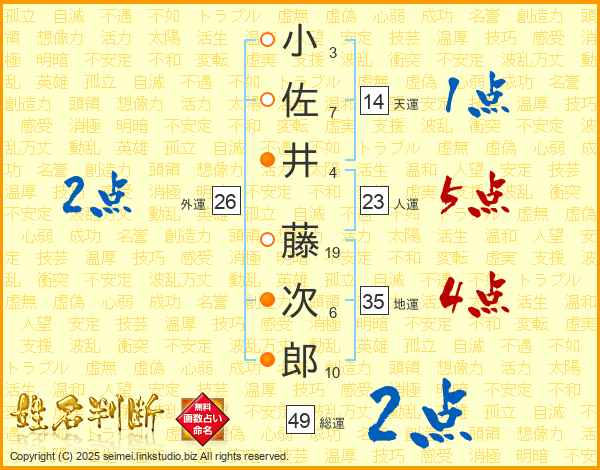 小(3画)佐(7画)井(4画) 藤(19画)次(6画)郎(10画)