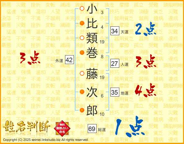 小(3画)比(4画)類(19画)巻(8画) 藤(19画)次(6画)郎(10画)