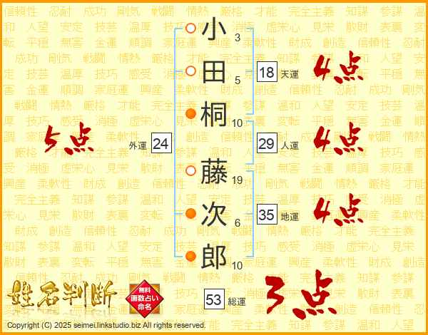 小(3画)田(5画)桐(10画) 藤(19画)次(6画)郎(10画)