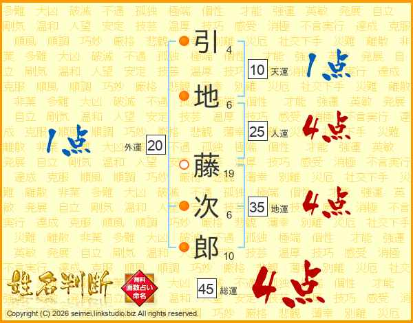 引(4画)地(6画) 藤(19画)次(6画)郎(10画)