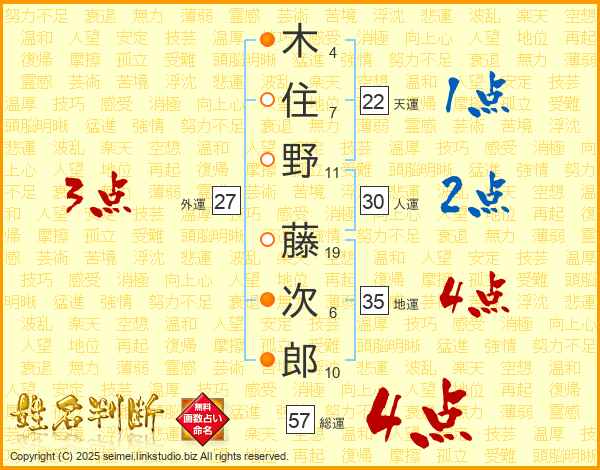 木(4画)住(7画)野(11画) 藤(19画)次(6画)郎(10画)