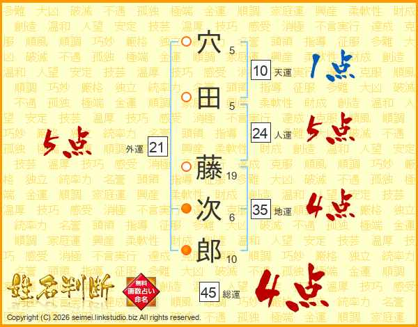 穴(5画)田(5画) 藤(19画)次(6画)郎(10画)