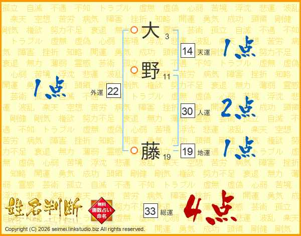 生活面を象徴する運勢です。外部から受ける影響力を表し、結婚運、家庭運や職場、環境への順応性を表します。総運から人運を引いた画数。姓や名が1文字の場合を除く。