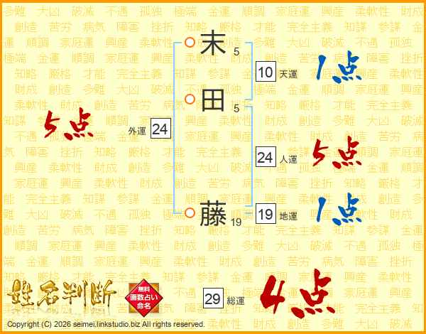 生活面を象徴する運勢です。外部から受ける影響力を表し、結婚運、家庭運や職場、環境への順応性を表します。総運から人運を引いた画数。姓や名が1文字の場合を除く。