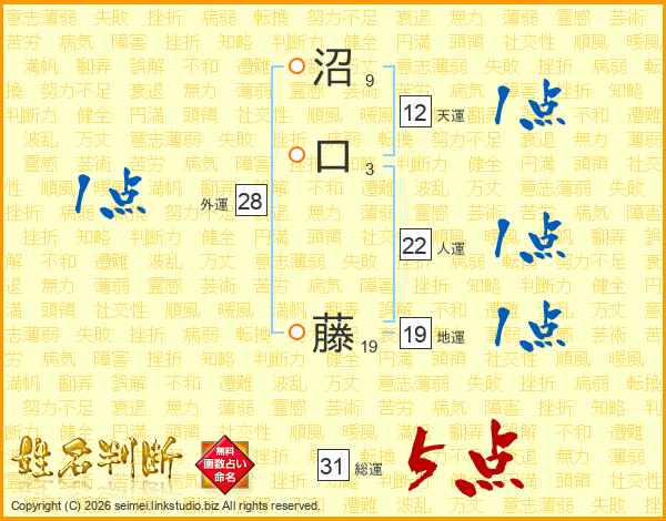 沼口藤さんの総運は31画の5点!