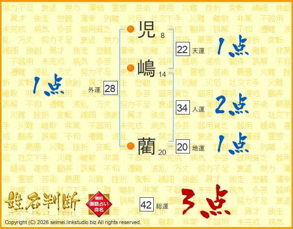 生活面を象徴する運勢です。外部から受ける影響力を表し、結婚運、家庭運や職場、環境への順応性を表します。総運から人運を引いた画数。姓や名が1文字の場合を除く。