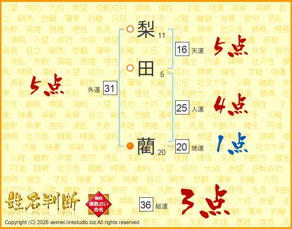 生活面を象徴する運勢です。外部から受ける影響力を表し、結婚運、家庭運や職場、環境への順応性を表します。総運から人運を引いた画数。姓や名が1文字の場合を除く。