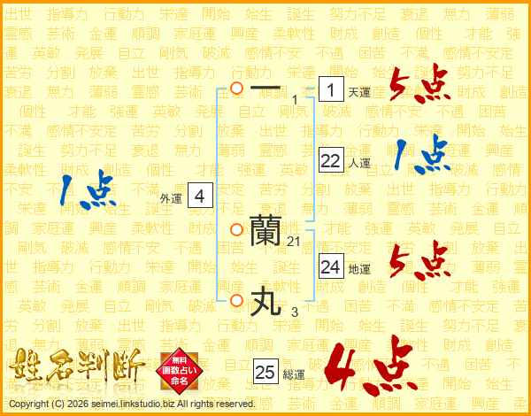 生活面を象徴する運勢です。外部から受ける影響力を表し、結婚運、家庭運や職場、環境への順応性を表します。総運から人運を引いた画数。姓や名が1文字の場合を除く。