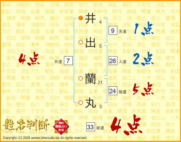 井(4画)出(5画) 蘭(21画)丸(3画)