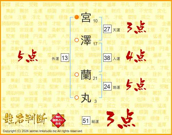 宮(10画)澤(17画) 蘭(21画)丸(3画)