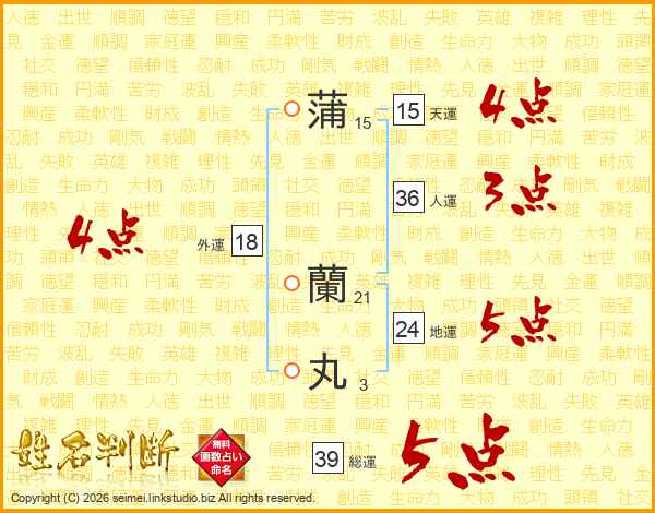 蒲蘭丸さんの総運は39画の5点!