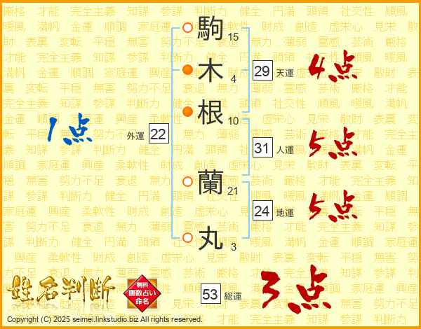 駒(15画)木(4画)根(10画) 蘭(21画)丸(3画)