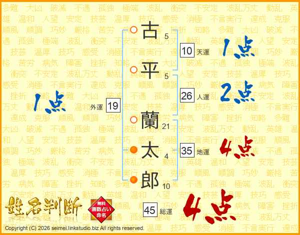古(5画)平(5画) 蘭(21画)太(4画)郎(10画)