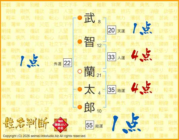 武(8画)智(12画) 蘭(21画)太(4画)郎(10画)
