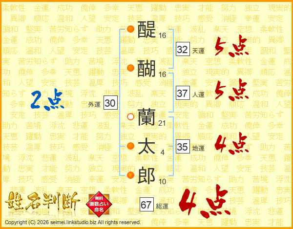 醍醐蘭太郎さんの総運は67画の4点!