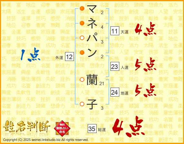 マ(2画)ネ(4画)パ(3画)ン(2画) 蘭(21画)子(3画)