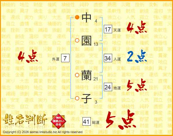 生活面を象徴する運勢です。外部から受ける影響力を表し、結婚運、家庭運や職場、環境への順応性を表します。総運から人運を引いた画数。姓や名が1文字の場合を除く。
