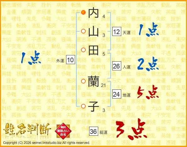 内(4画)山(3画)田(5画) 蘭(21画)子(3画)