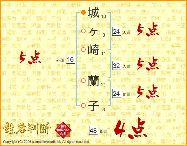 城(10画)ヶ(3画)崎(11画) 蘭(21画)子(3画)