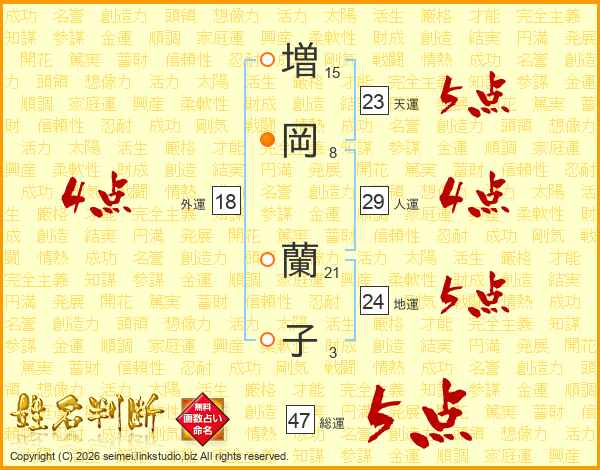 増(15画)岡(8画) 蘭(21画)子(3画)