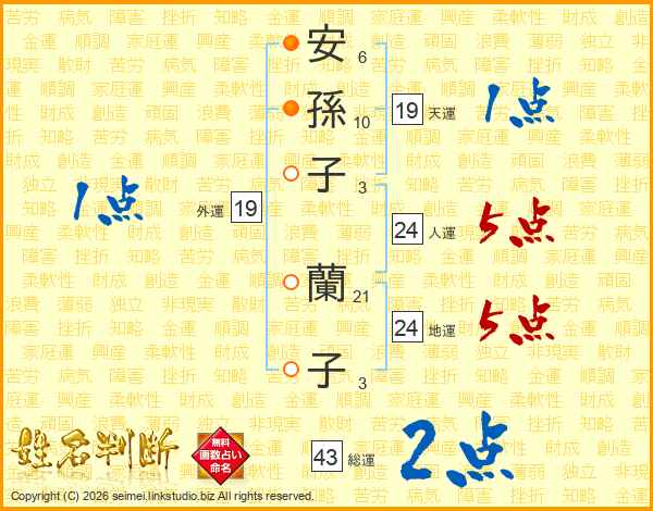 安(6画)孫(10画)子(3画) 蘭(21画)子(3画)