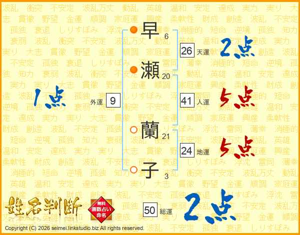 早瀬蘭子さんの総運は50画の2点!