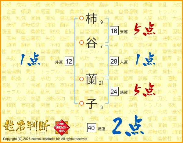 柿(9画)谷(7画) 蘭(21画)子(3画)