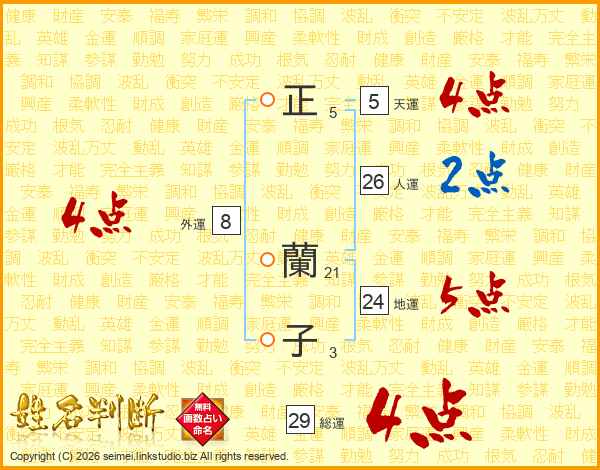 生活面を象徴する運勢です。外部から受ける影響力を表し、結婚運、家庭運や職場、環境への順応性を表します。総運から人運を引いた画数。姓や名が1文字の場合を除く。