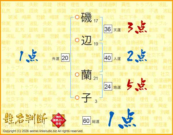 磯(17画)辺(19画) 蘭(21画)子(3画)