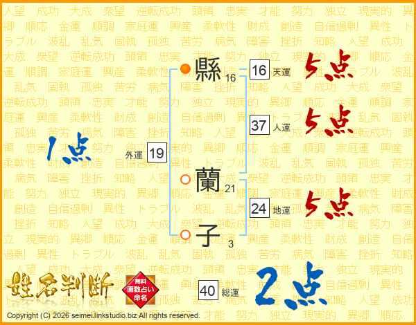 生活面を象徴する運勢です。外部から受ける影響力を表し、結婚運、家庭運や職場、環境への順応性を表します。総運から人運を引いた画数。姓や名が1文字の場合を除く。