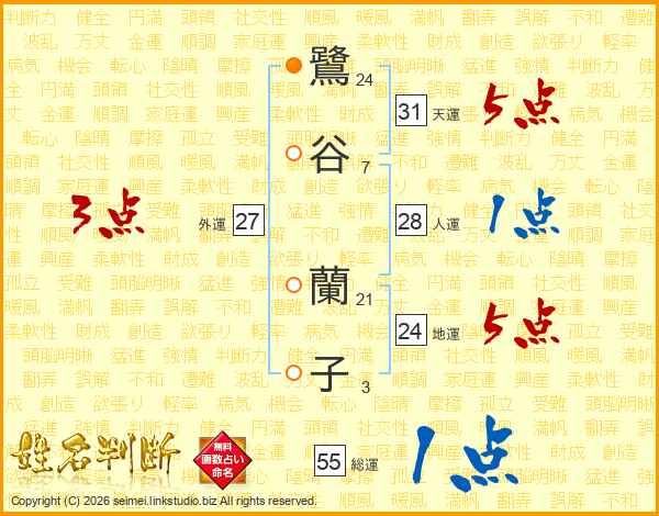 鷺(24画)谷(7画) 蘭(21画)子(3画)