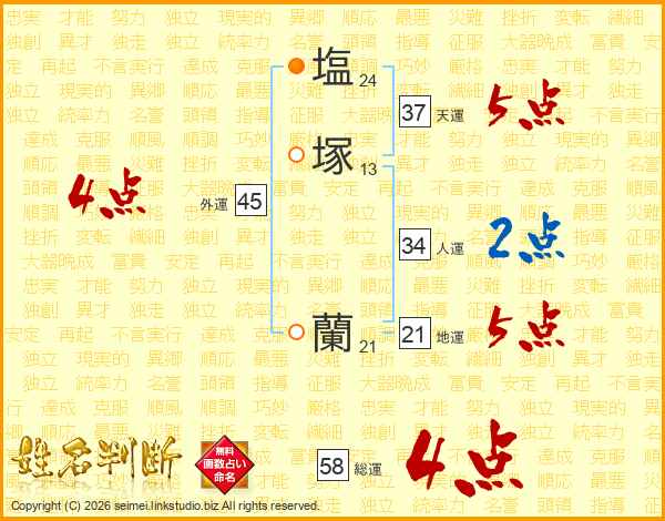 あなたの人生を表す1番重要な運勢です。生涯を通じて影響する総合運となり、主に50歳以降の晩年期に影響を及ぼします。苗字と名前の合計画数。