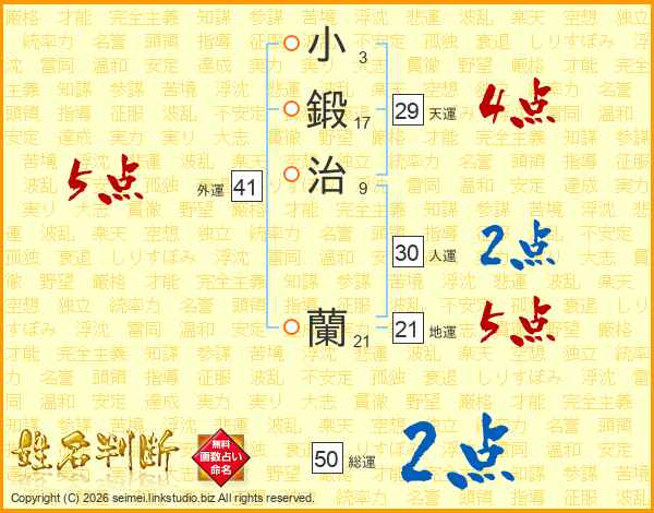 小(3画)鍛(17画)治(9画) 蘭(21画)