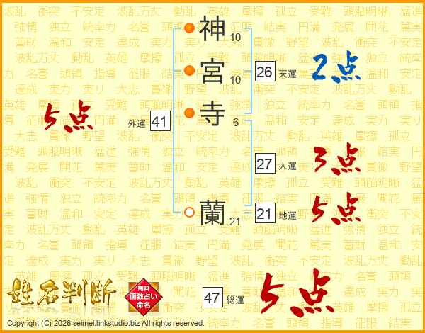 神(10画)宮(10画)寺(6画) 蘭(21画)