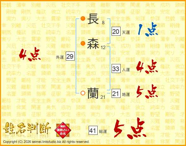 あなたの人生を表す1番重要な運勢です。生涯を通じて影響する総合運となり、主に50歳以降の晩年期に影響を及ぼします。苗字と名前の合計画数。