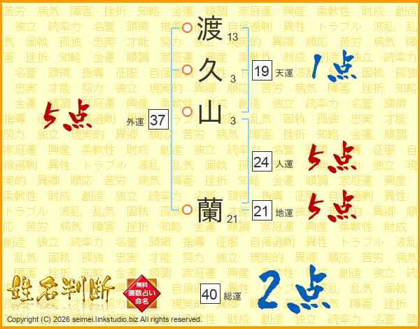 渡(13画)久(3画)山(3画) 蘭(21画)